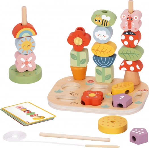 Rijgen, vormen- en kleurensorteren, torens bouwen op pinnetjes, koppelen en spelen volgens voorbeelden – alles in één compacte set voor dagelijks ontdekken.