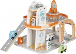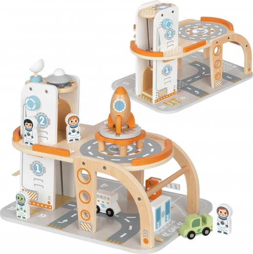 Dit doordacht ontworpen houten speelgoed neemt kinderen mee naar de wereld van ruimtemissies. De meerlaagse constructie met duidelijke baanmarkeringen, een bewegende lift en een lange afdaalhelling nodigt uit tot verhalen vol starts, landingen en servicetaken. De set wordt aangevuld met astronautenfiguren, een landingsplatform met raket, een rover en andere accessoires voor realistisch spel.