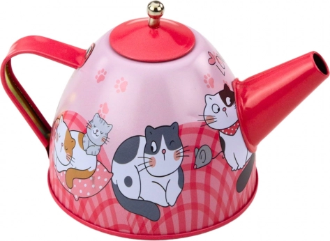 Metalen theeservies voor kinderen met kattenmotief in het roze, met 15 stuks voor veilig en creatief spel.