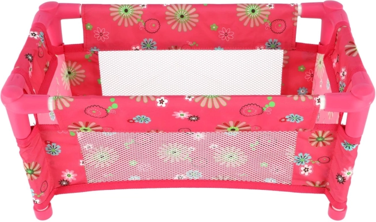 De robuuste maar lichte constructie met buizen en textielpanelen is bestand tegen dagelijks speelplezier. Het bedje wordt geleverd zonder matras (zonder vaste bodem), waardoor het een veilige en flexibele toevoeging is aan de kinderkamer. Het vrolijke bloemenmotief in roze tinten zal elke kleine poppenmoeder blij maken.