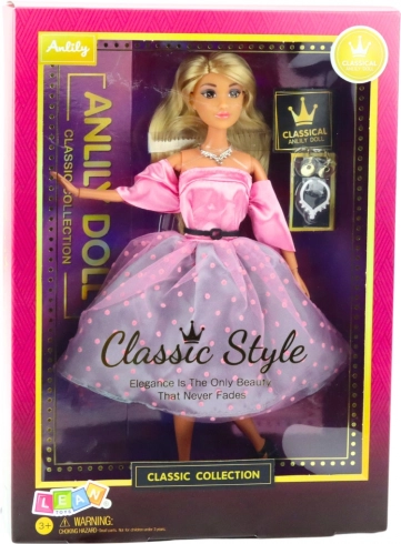De Anlily-pop is gekleed in een klassieke roze-witte jurk met een tulelaag, die extra elegantie en stijl geeft. De uitlopende rok met delicate, doorschijnende tule en het satijnen korset met mouwen vormen een indrukwekkend geheel.