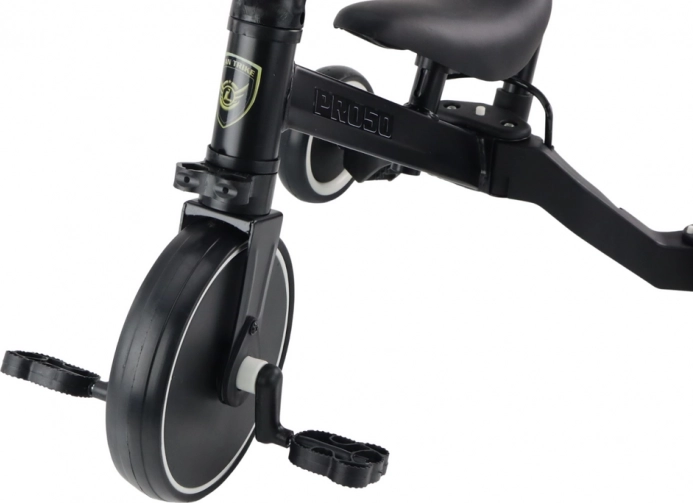 Het model PRO50 is uitgerust met een praktische duwstang die gemakkelijk kan worden verwijderd zodra het kind zelfstandig gaat rijden. De constructie maakt rijden mogelijk met zowel gespreide als gekoppelde achterwielen, wat de stabiliteit in de beginfase vergroot en een soepele overgang naar een traditionelere fiets biedt.