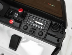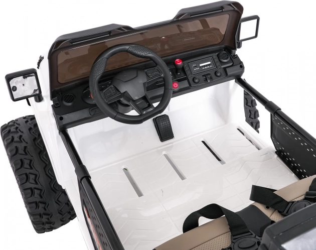 De veiligheid wordt gewaarborgd door gordels, een soepele zachte start, een 2,4 GHz afstandsbediening met drie snelheden en een nood-Stop-knop. Kinderen worden blij van de LED-lampen (voor, achter, boven) met aparte schakelaar en het multimediapaneel met Bluetooth, USB, MP3 en AUX. Onder de motorkap zit een praktische opbergbox van 51 × 26 × 8 cm.