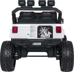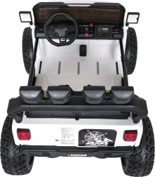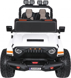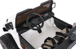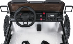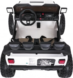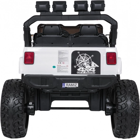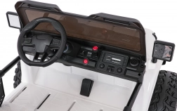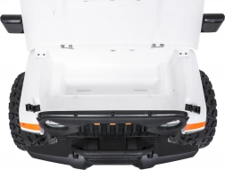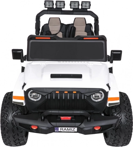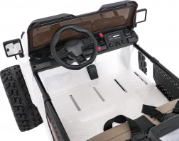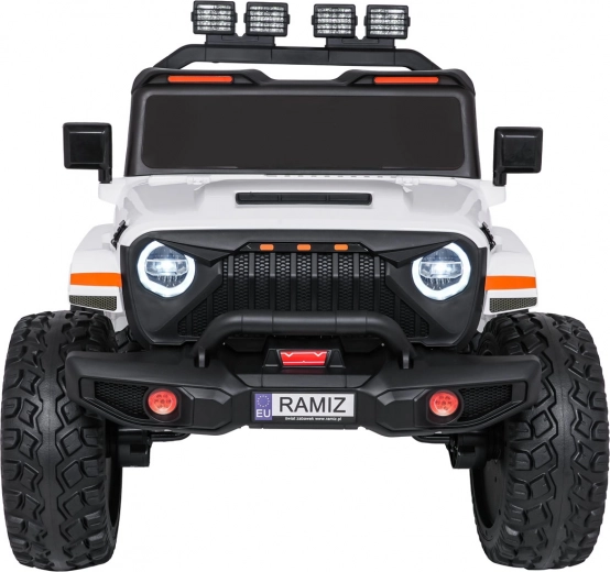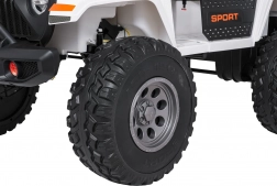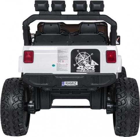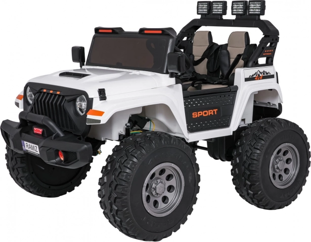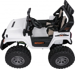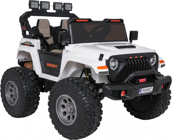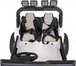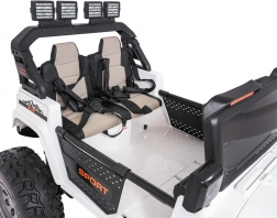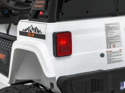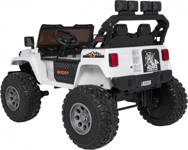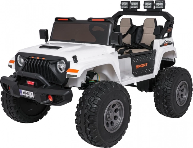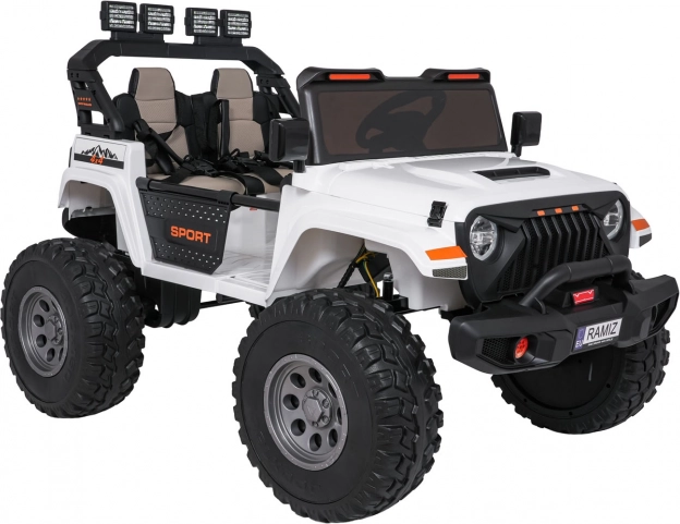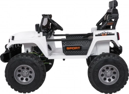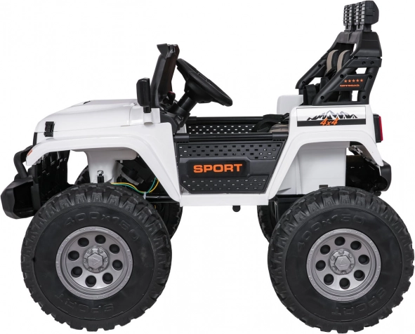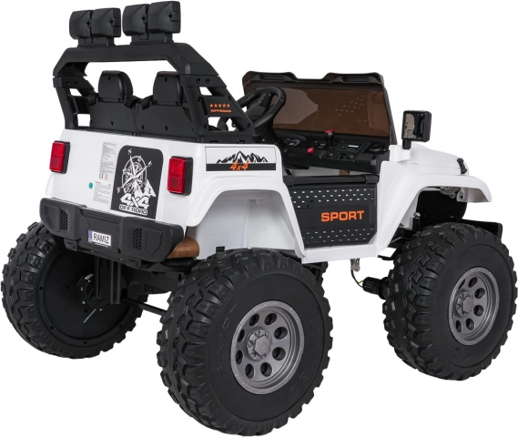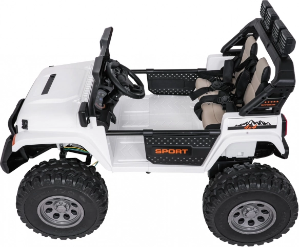 De Extreme Sport 4x4 in het wit is een ruime elektrische kinderauto die een stoere offroad-look combineert met een hoge bodemvrijheid van 33 cm en het comfort van een dubbele stoel van eco-leer. Dankzij vier onafhankelijke motoren (voor 2×200 W, achter 2×280 W) en twee 12 V 7 Ah-accu’s in 24 V serieaansluiting kan hij ook zwaardere ondergronden aan.