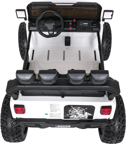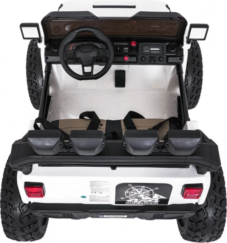Dubbele stoel van eco-leer met veiligheidsgordels, 2,4 GHz afstandsbediening met 3 snelheden en STOP-knop. Multimediapaneel met Bluetooth, USB, MP3 en AUX voor favoriete muziek.