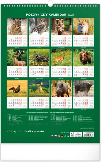 Muurkalender ontworpen voor jagers, met indrukwekkende foto's van dieren en informatie over jachtseizoenen en tijden van zonsopgang en zonsondergang.