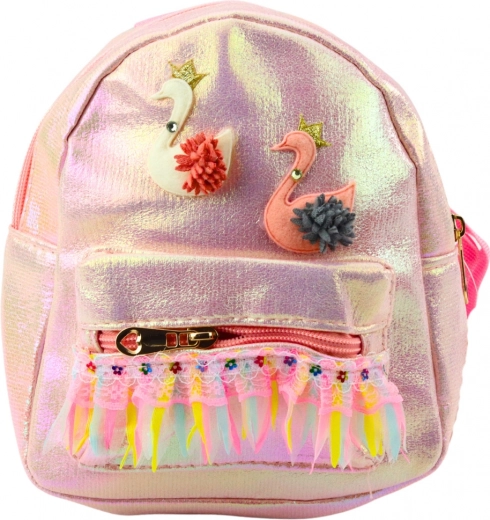 Het model heeft twee vakken – een ruim hoofdcompartiment en een voorvak, beide afsluitbaar met een rits. De rugzak biedt plaats aan alles wat een kind dagelijks nodig heeft: een snack, een speeltje, een flesje of een boek. Decoratieve details, zoals zwanenapplicaties met bloemen en gekleurde veertjes, maken hem niet alleen functioneel maar ook een opvallende accessoire.