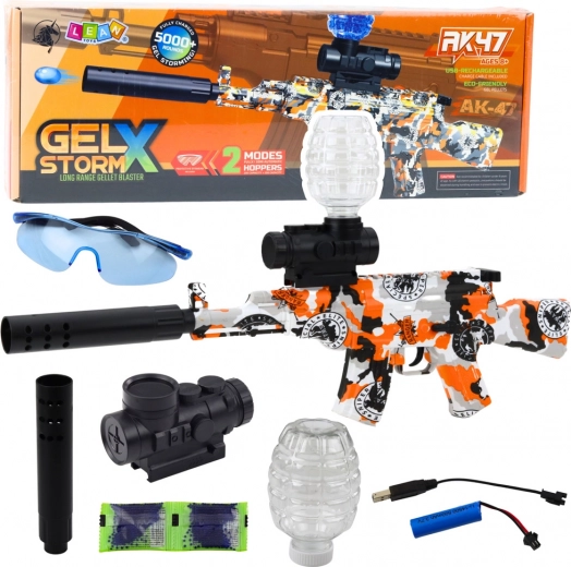 De karabijn schiet watergelkogels die zacht en veilig zijn na het weken. Reikwijdte en nauwkeurigheid maken team- en solo spellen mogelijk die reflexen, precisie en bewegingscoördinatie bij kinderen verbeteren. Het speelgoed is geschikt voor kinderen boven de 14 jaar en is een geweldig alternatief voor traditionele schietpistolen - de munitie is licht, biologisch afbreekbaar en laat geen sporen na.