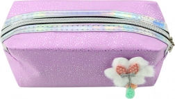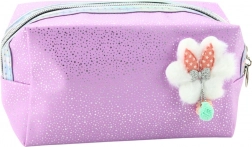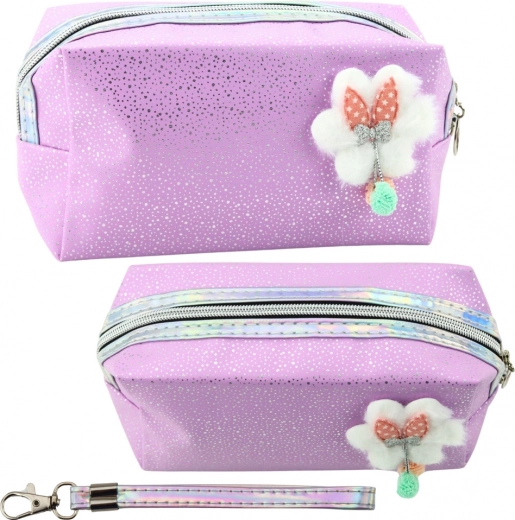 De stijlvolle cosmetische etui is een unieke aanvulling op de schooluitrusting of voor dagelijks gebruik. Gemaakt in een opvallende paarse kleur en versierd met subtiele, glinsterende deeltjes, trekt hij de aandacht met zijn onmiskenbare design. Op de voorkant van de etui zit een schattige applicatie in de vorm van een pluizig wolkje met een strik, waaraan twee decoratieve bolletjes zijn bevestigd die het geheel een unieke charme geven.