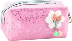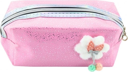 Dit etui voor cosmetica of schoolspullen is uitgevoerd in een elegante roze tint en versierd met fijne glitters. Op de voorkant zit een schattige applicatie in de vorm van een fluffy wolkje met een strikje, waaraan twee decoratieve bolletjes zijn bevestigd die het geheel een unieke charme geven.