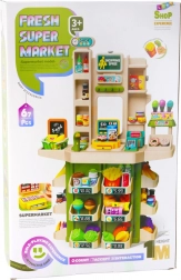 Verander de kamer van uw kind in een realistische supermarkt met de interactieve speelgoedset Verse Super Market. Deze set van 67 delen bevat imitatievoedsel, drankjes, verpakkingen, groente en fruit, een kassa met knoppen, een prijsscanner, een terminal en presentatierekken, zodat het kind zowel verkoper als klant kan zijn.