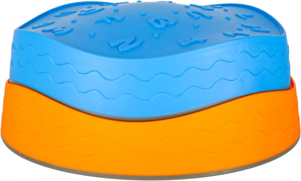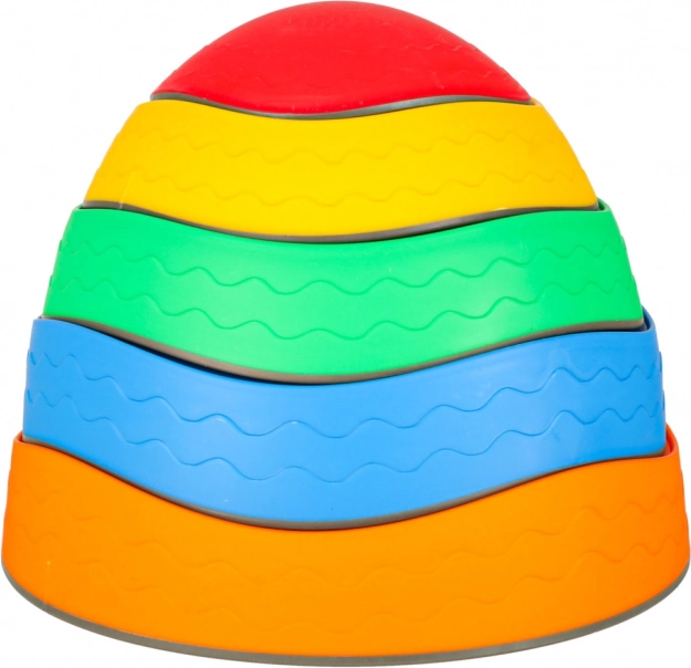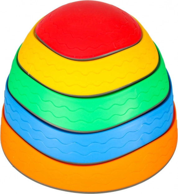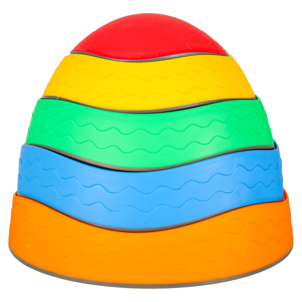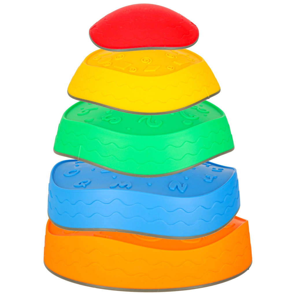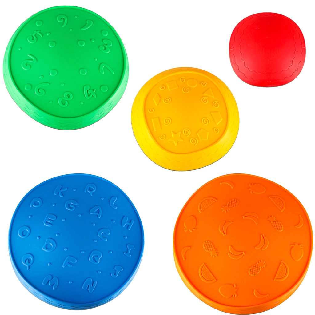 Deze set bevat vijf verschillend gekleurde stenen: rood met ornamenten, geel met vormen, oranje met fruitmotieven, blauw met letters en groen met cijfers. Elke steen is gemaakt van stevig polyurethaan, wat duurzaamheid en een lange levensduur garandeert.