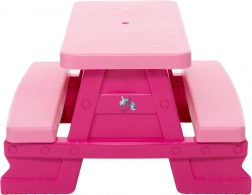 Deze picknicktafel voor kinderen is gemaakt van opvallend roze kunststof dat niet alleen stijlvol oogt, maar ook gemakkelijk de aandacht van kinderen trekt.