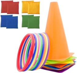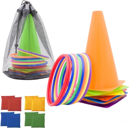 De set bevat 11 gekleurde hoepels, die uitstekend geschikt zijn voor werpspellen en vaardigheidsactiviteiten, 6 trainingskegels voor hindernisbanen en 10 gymnastiekzakjes, die kunnen worden gebruikt voor sensorisch spel, werpen of als verzwaring. Alle componenten zijn gemaakt van duurzame en veilige materialen, geschikt voor zowel kinderen als volwassenen.