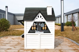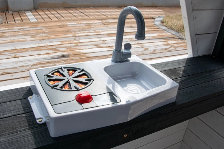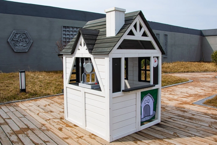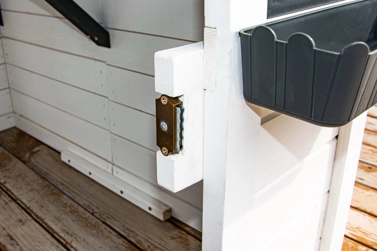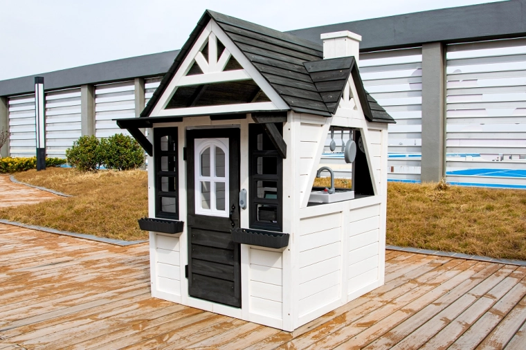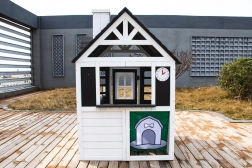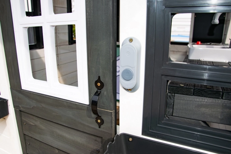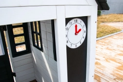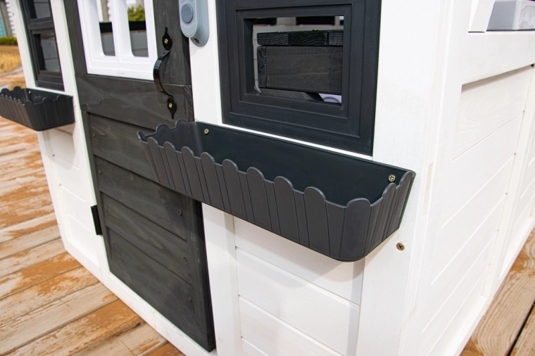 Het keukentje, als onderdeel van het huisje, bevat een kookplaat met draaiknop, een gootsteen en basisservies, zodat kinderen heerlijke menu’s kunnen bereiden voor hun vriendjes en ouders. Verdere extra’s zijn een klok, bloembakjes en een praktische ingang voor de hond, afgedekt met een gordijntje. De deurbel werkt op 3 LR44-batterijen, die niet zijn inbegrepen. Het huisje wordt geleverd als bouwpakket met een gedetailleerde montagehandleiding.