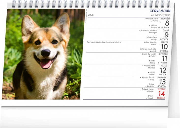 Bureaubladkalender Honden 2026 met Tsjechische en Slowaakse kalender, hondennamen en prachtige foto’s.