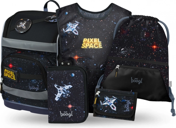 Deze scholenset Zippy Plus Pixel Space van Baagl bevat een schooltas, etui, gymzak, schort en portemonnee. Geschikt voor jonge schoolkinderen met nadruk op functionaliteit en kwaliteit.