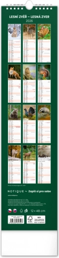 Mooie Tsjechisch-Slowaakse wandkalender Bosdieren 2026 met maanfasen en ruimte voor notities.