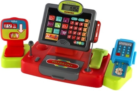 Grote kinderkassa die elke hoek in een klein winkeltje verandert. Biedt licht- en geluidseffecten, een werkende rekenmachine, een kaartlezer en een weegschaal voor fruit en groenten. Inclusief nepgeld (biljetten en munten) en voedingsmiddelen. Voeding 2× AA (niet inbegrepen). Geschikt vanaf 3 jaar.