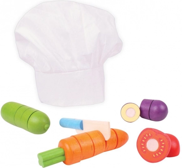 • Complete set – houten mes, groenten en textielen koksmuts.
