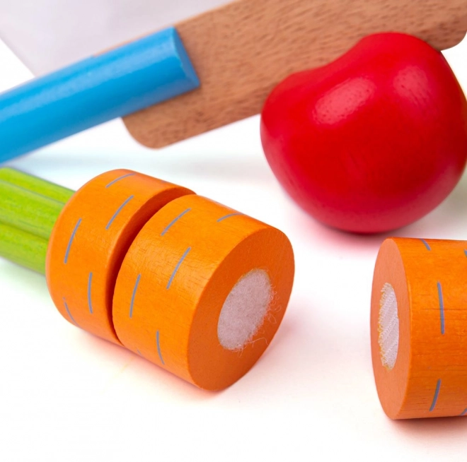 Kleurrijke set voor keukenspel met houten groenten met klittenband, een veilig mes en een witte koksmuts. Ondersteunt fijne motoriek, creativiteit en leert gezonde voeding en keukenveiligheid.