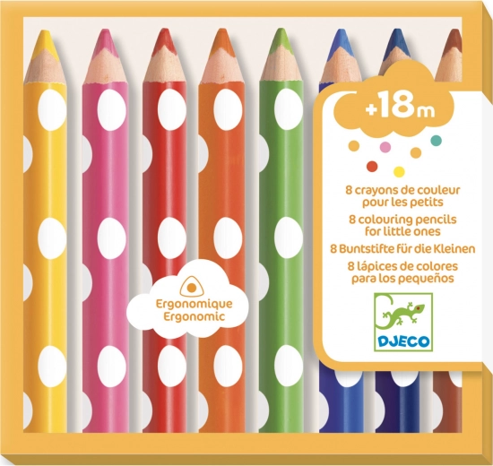 De set van acht DJECO-kleurpotloden is ideaal voor kleine kunstenaars. Deze potloden hebben een ergonomisch ontwerp dat perfect in kinderhanden past en tekenen makkelijker maakt. Eenvoudig te gebruiken en levendige kleuren zullen elk kind blij maken.