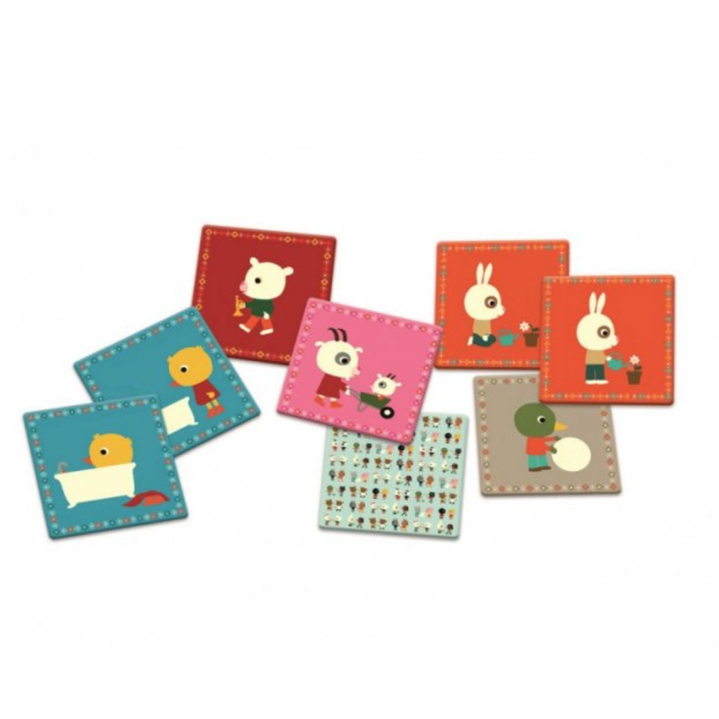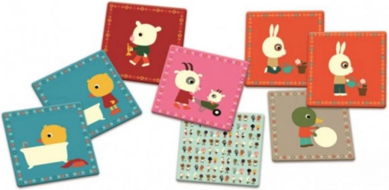 Pexeso Vrienden in actie van het merk Djeco biedt uren plezier voor kinderen en volwassenen met interactieve kaarten en kleurrijke illustraties die het geheugen en de aandacht stimuleren.