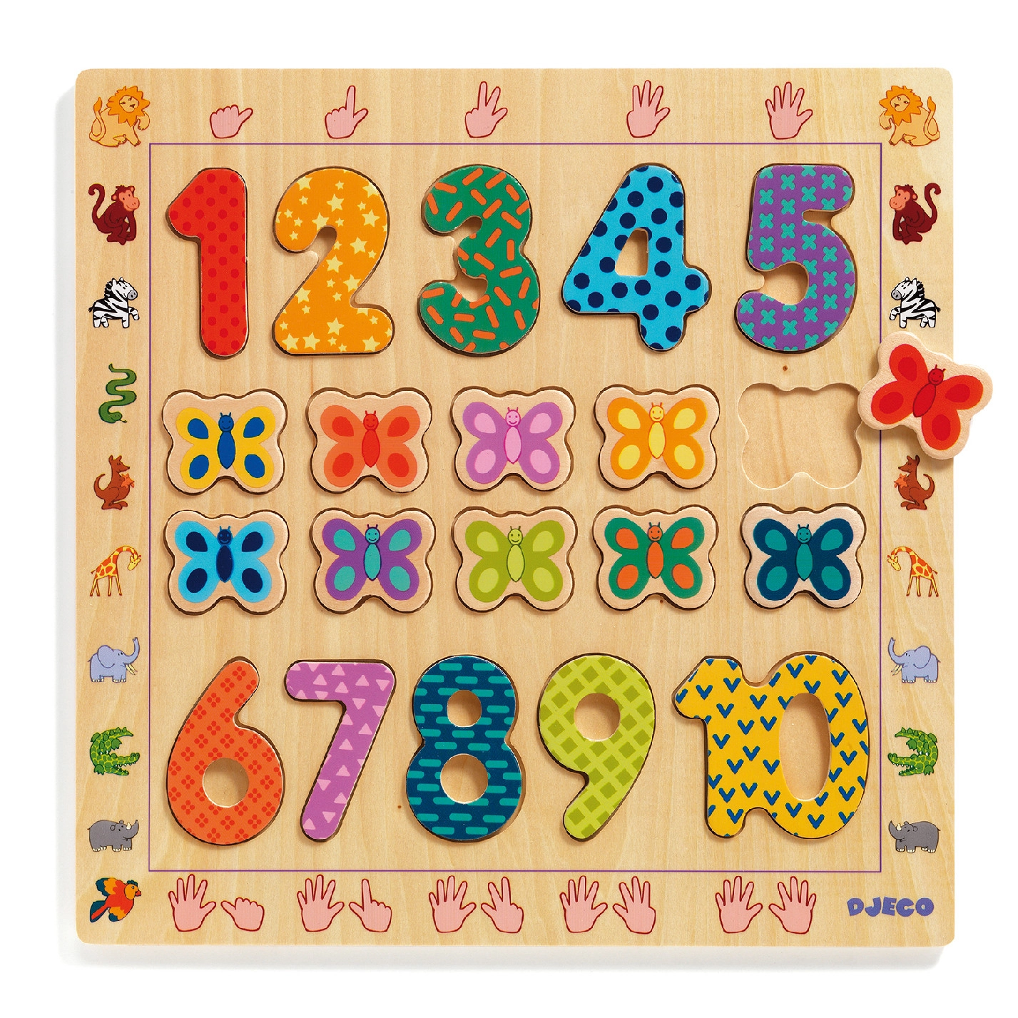 Duik in de wereld van leuk leren met de inlegpuzzel DjECO Tellen met vlindertjes. Ontworpen voor de ontwikkeling van de motoriek en rekenvaardigheden van je kind.