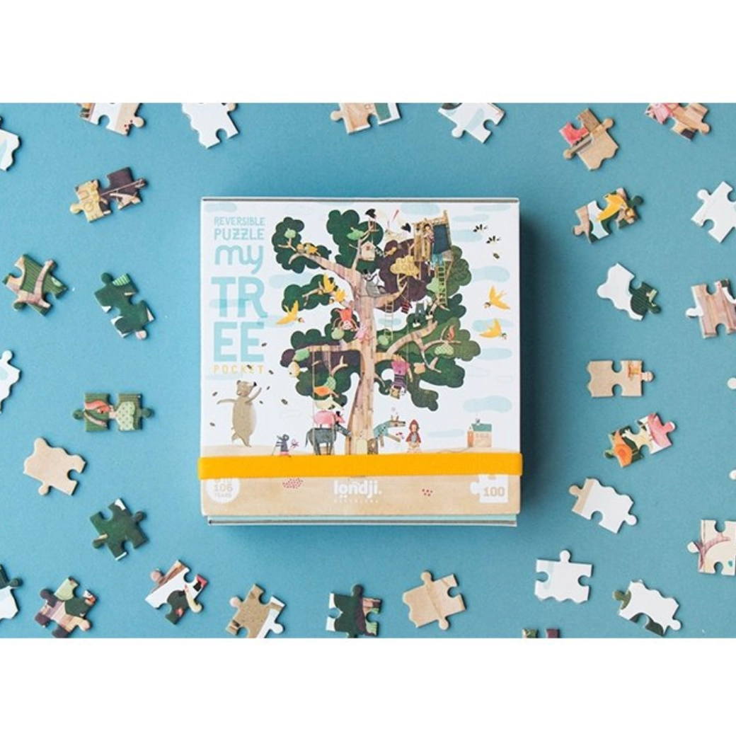 Ontdek de wereld van Londji met deze unieke pocket dubbelzijdige puzzel. Met een illustratie van een boom aan de ene kant en een verrassend ontwerp aan de andere kant beleef je dubbel zoveel plezier.