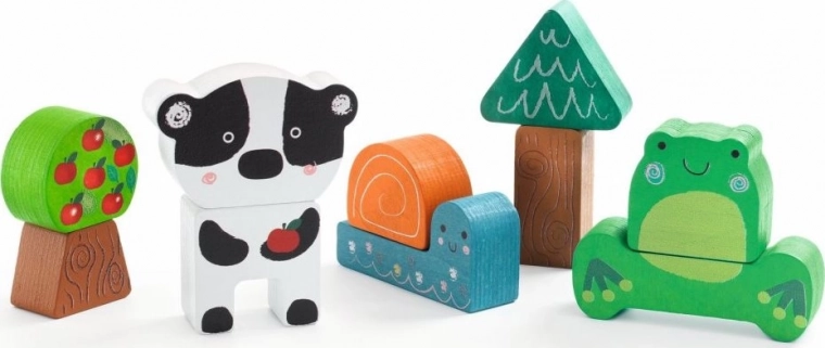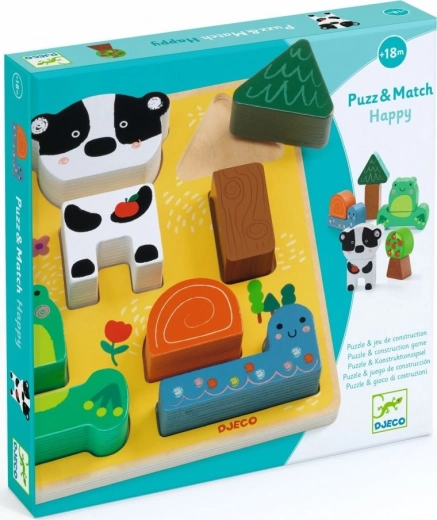 De houten set Djeco Puzz & Match Happy Dieren biedt leuk puzzelen en bouwen in één. Dankzij de brede puzzelstukjes liggen ze prettig in kleine handjes en is de hantering natuurlijk en veilig. Sommige elementen kun je rechtop neerzetten, wat het spel uitbreidt met fantasierijke scènes en de creativiteit stimuleert.
