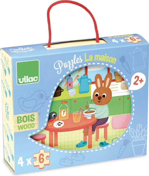 Deze schattige houten VILAC-puzzels met huishoudthema brengen kinderen plezier bij het ontdekken en leggen. Vier verschillende afbeeldingen zorgen voor gevarieerd speelplezier, terwijl de compacte houten box met handvat het dragen en opbergen vergemakkelijkt.