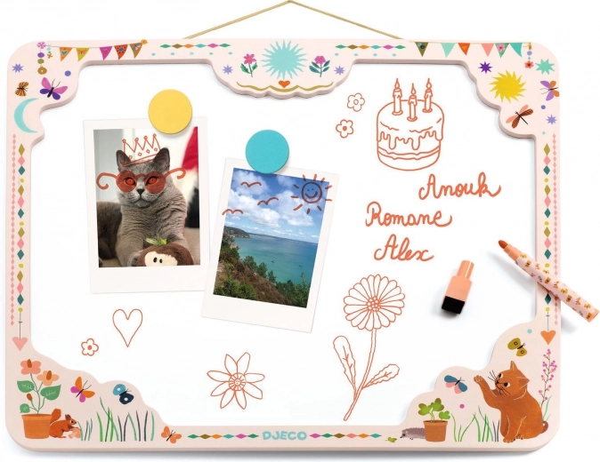 Stijlvol magnetisch bord met kattenmotief van het merk DJECO voor kinderkamers en speelruimtes. Het heeft een houten frame, een metalen schrijf-/magnetisch oppervlak, een gekleurde ophangkoord en een whiteboardstift met magnetische dop. Perfect om te tekenen, berichten te schrijven en magneten te bevestigen.