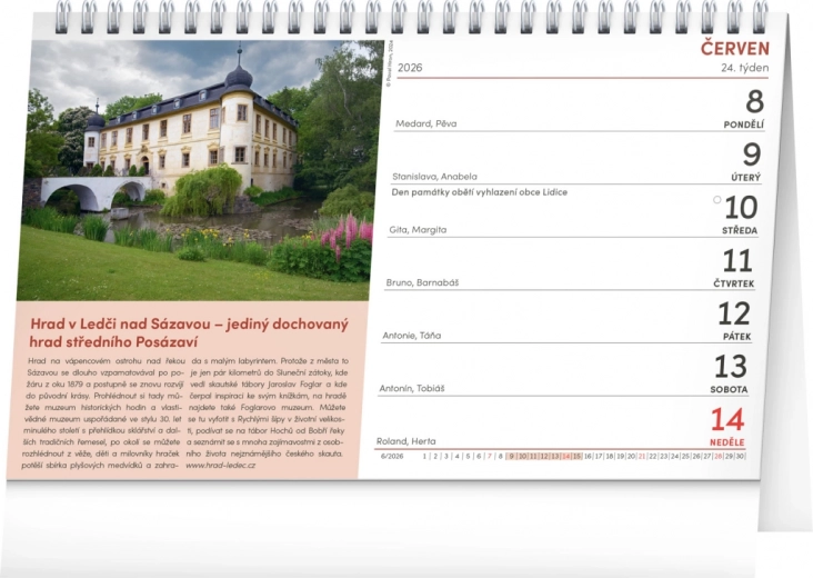 Ga op reis langs de betoverende kastelen en paleizen van Bohemen, Moravië en Silezië met onze bureaukalender met kleurrijke foto’s van P. Hron. De kalender bevat ook een wekelijkse kalender in het Tsjechisch met ruimte voor je notities.