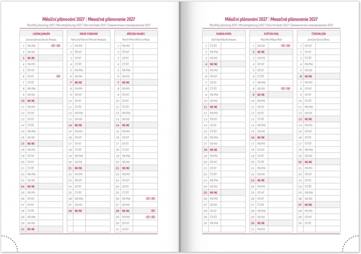 Het dagboek bevat ook nuttige details zoals feestdagen van de Tsjechische en Slowaakse republiek en internationale feestdagen, uitgebreide namenlijsten, een kaart van de Tsjechische en Slowaakse republiek en geperforeerde hoekjes. Voor een betere organisatie van je notities zijn er ook een textiele bladwijzer en ruimte voor persoonlijke gegevens.
