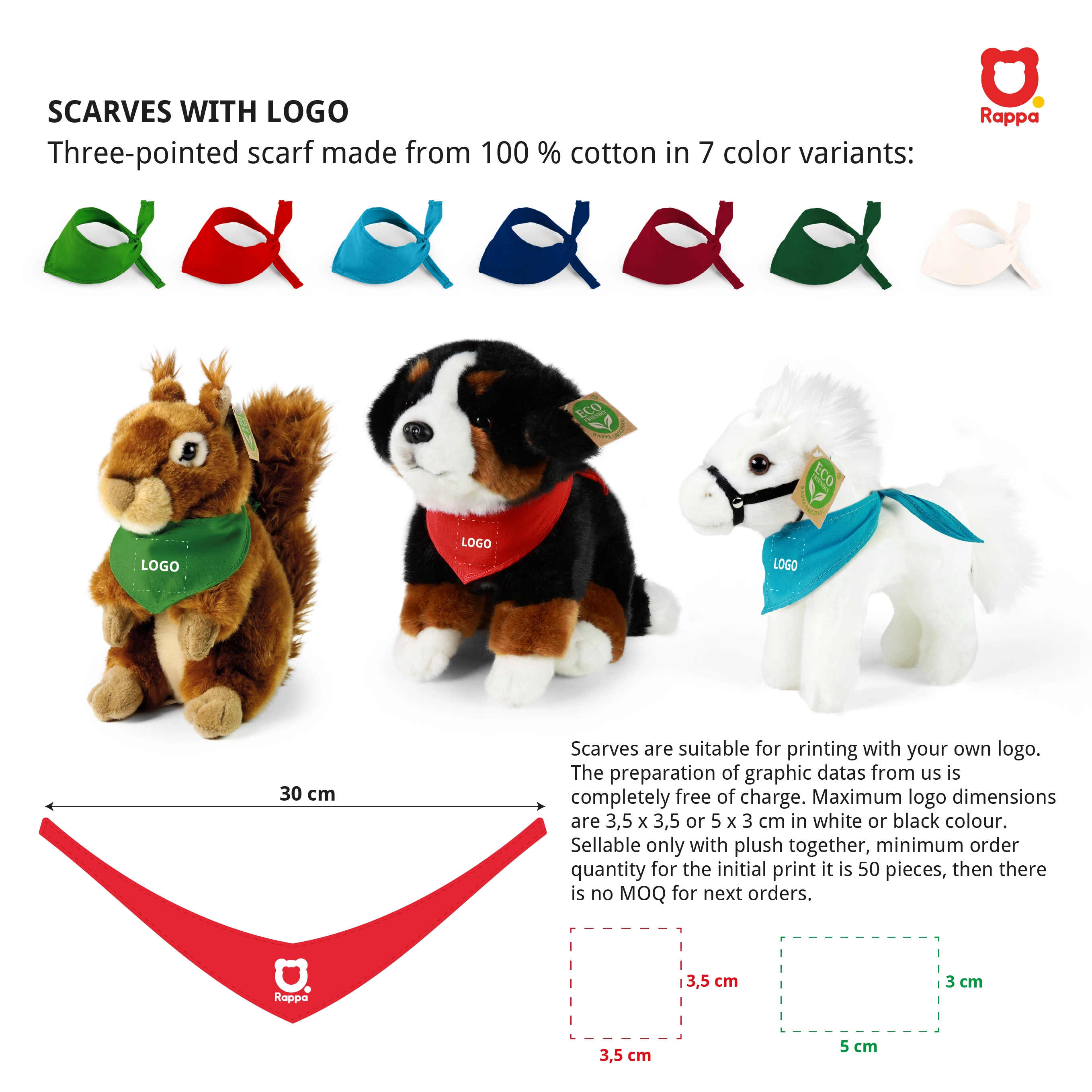 Geef je pluchen knuffels een persoonlijke stijl met deze elegante beige sjaal. Dankzij de optie voor gratis logobedrukking is hij ideaal voor promoties, geschenksets en corporate merchandising. De sjaal is geschikt voor pluchen knuffels tot 30 cm en vult hun uitstraling perfect aan.
