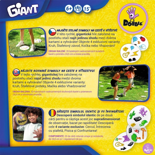 Beleef gigantisch veel plezier met Dobble Giant, waarbij je identieke symbolen zoekt en in hoog tempo wint! Deze grote versie van het populaire spel biedt nieuwe spelvarianten die ideaal zijn voor zowel buiten als binnen.