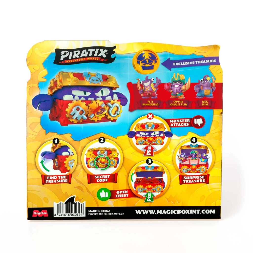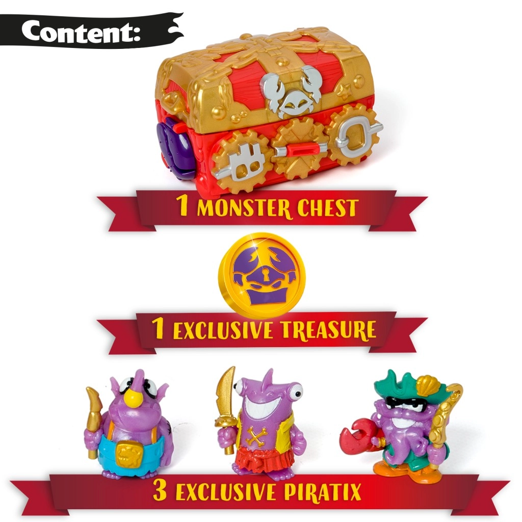 - 1 Monster Schatkist, 3 exclusieve Piratix-figuren, 1 exclusieve schatpenning, 3 accessoires