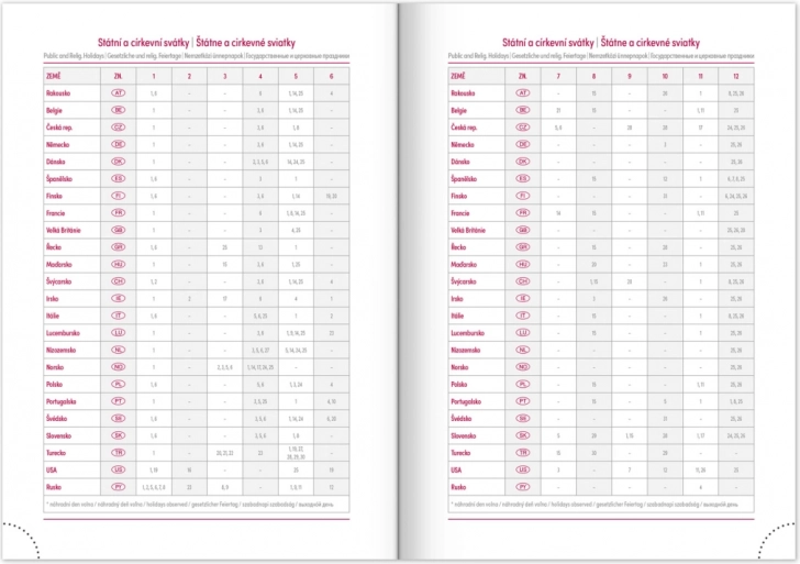 - Bevat een werkplanningskalender en een lijst van feestdagen van de Tsjechische en Slowaakse republiek evenals internationale feestdagen.