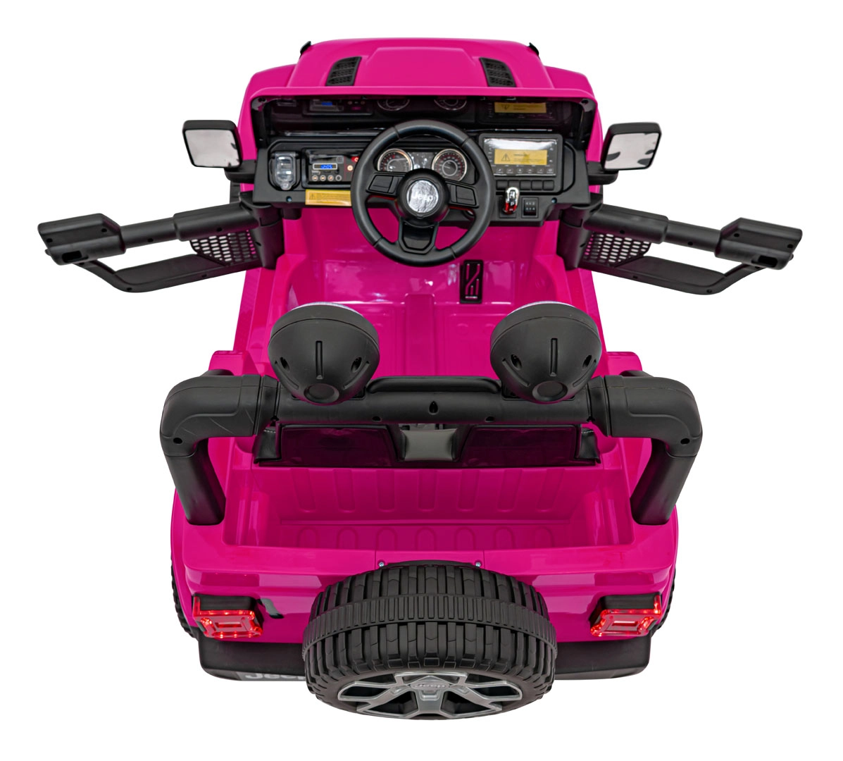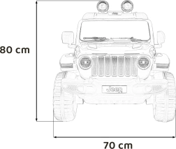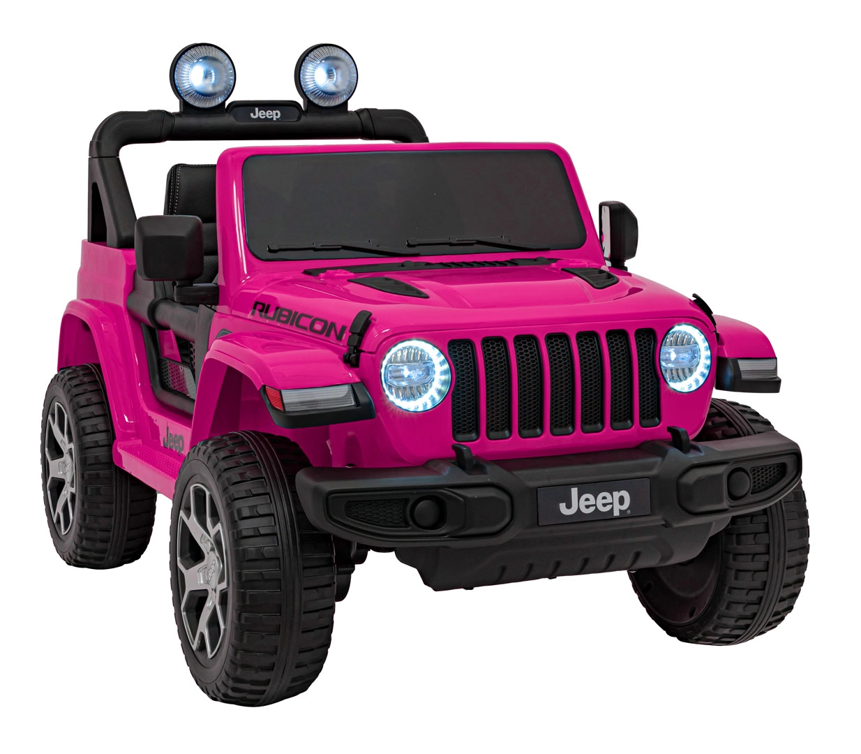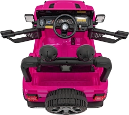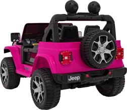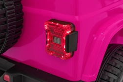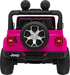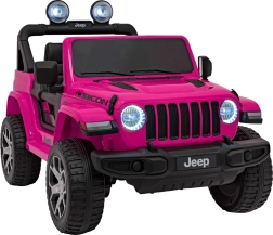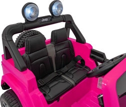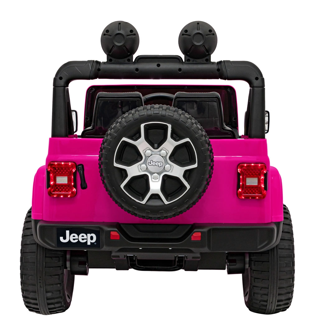 Stijlvolle kinderauto JEEP WRANGLER RUBICON in roze met een realistische rijervaring dankzij vier motoren 4×45 W, een sterke 12 V / 10 Ah accu en een 2,4 GHz afstandsbediening voor veilig ouderlijk toezicht. Voorzien van EVA-schuimbanden, LED-verlichting voor en op de lichtbalk, een comfortabel eco-lederen zitje met veiligheidsgordels en een multimedia audiopaneel met Bluetooth, USB, SD, MP3 en FM-radio. Deuren die open kunnen, voor- en achteropbergruimte en een inklapbare trekstang voor eenvoudig transport maken de premium uitrusting compleet.