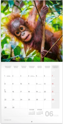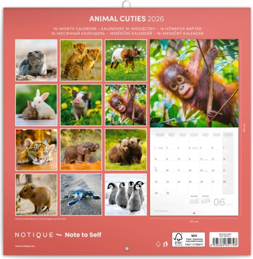 Notitiekalender Jonge Dieren 2026: schattige foto’s, maanfasen en feestdagen. Formaat 30x30 cm.