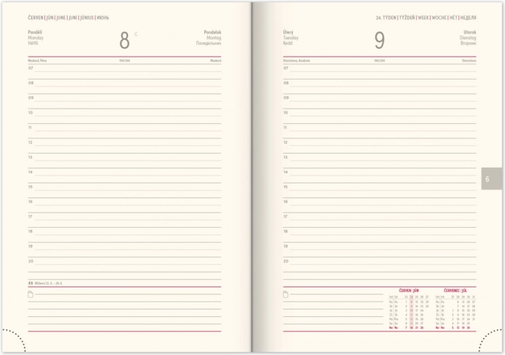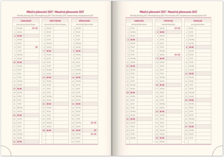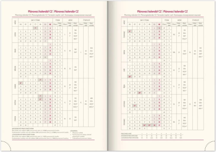 Verkrijg een agenda die aan al uw behoeften voldoet. Het dagelijkse overzicht biedt gemakkelijke toegang tot planning met de Tsjechisch-Slowaakse kalender aangevuld met Engels, Duits, Hongaars en Russisch. Profiteer ook van: