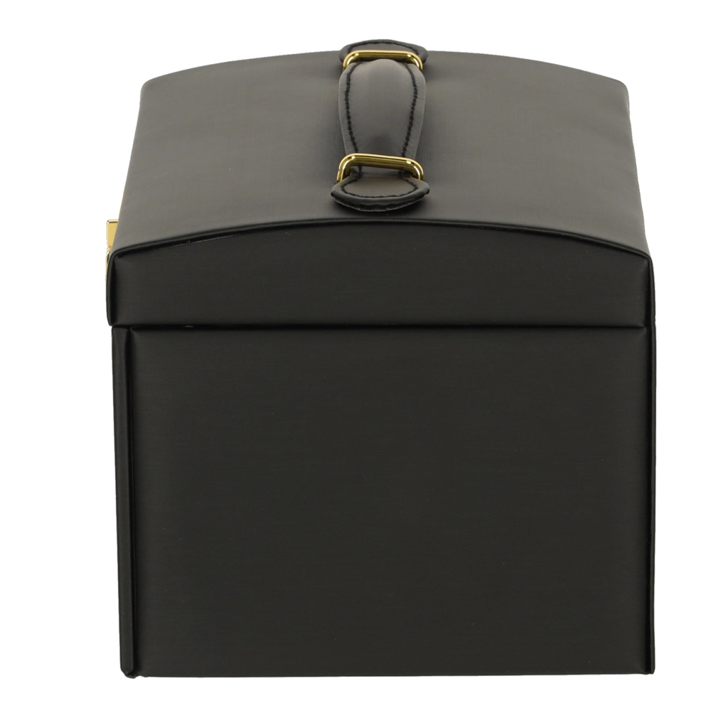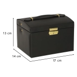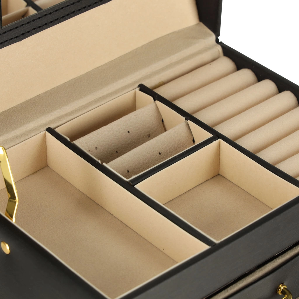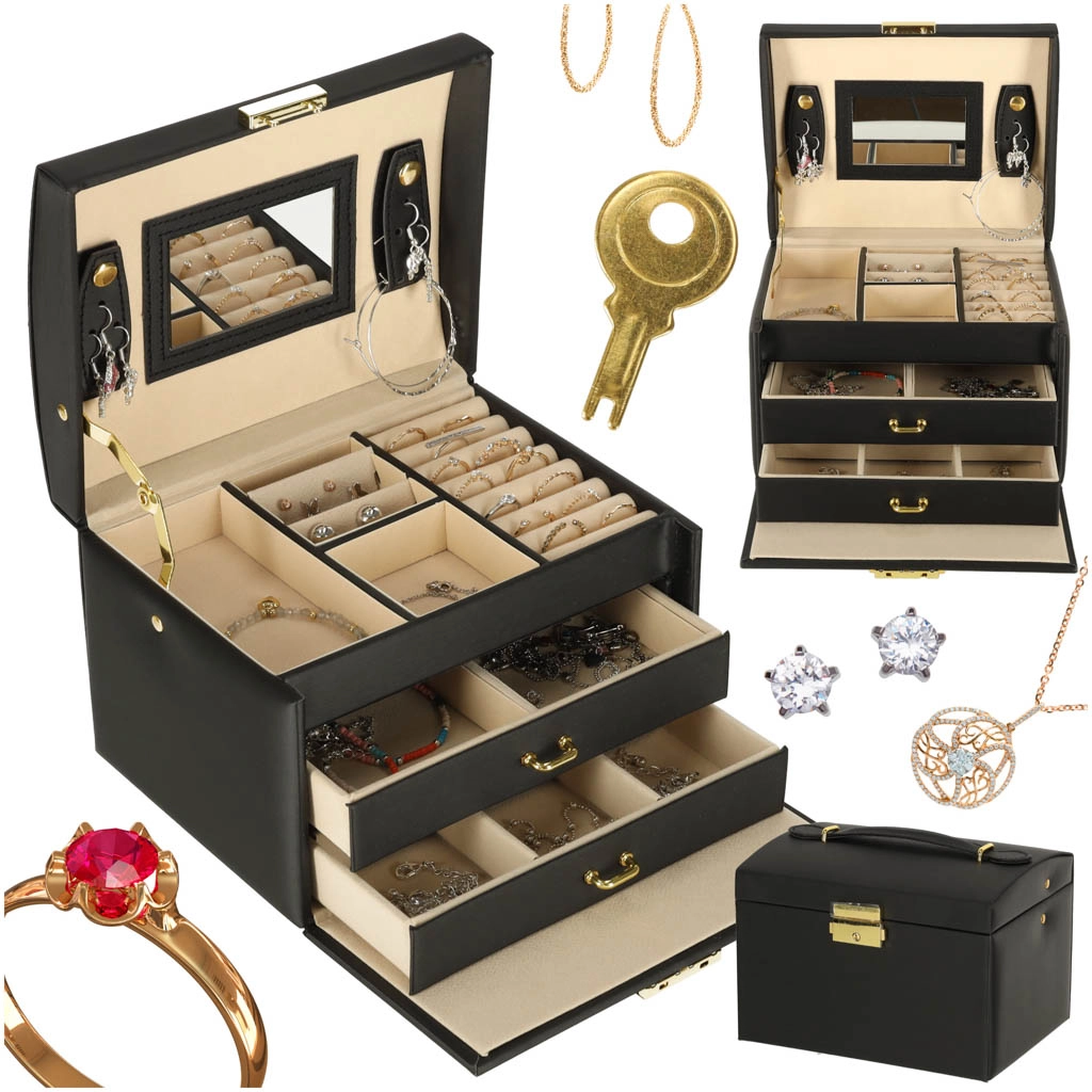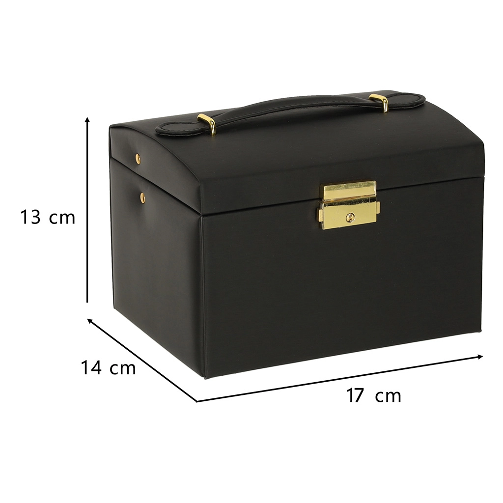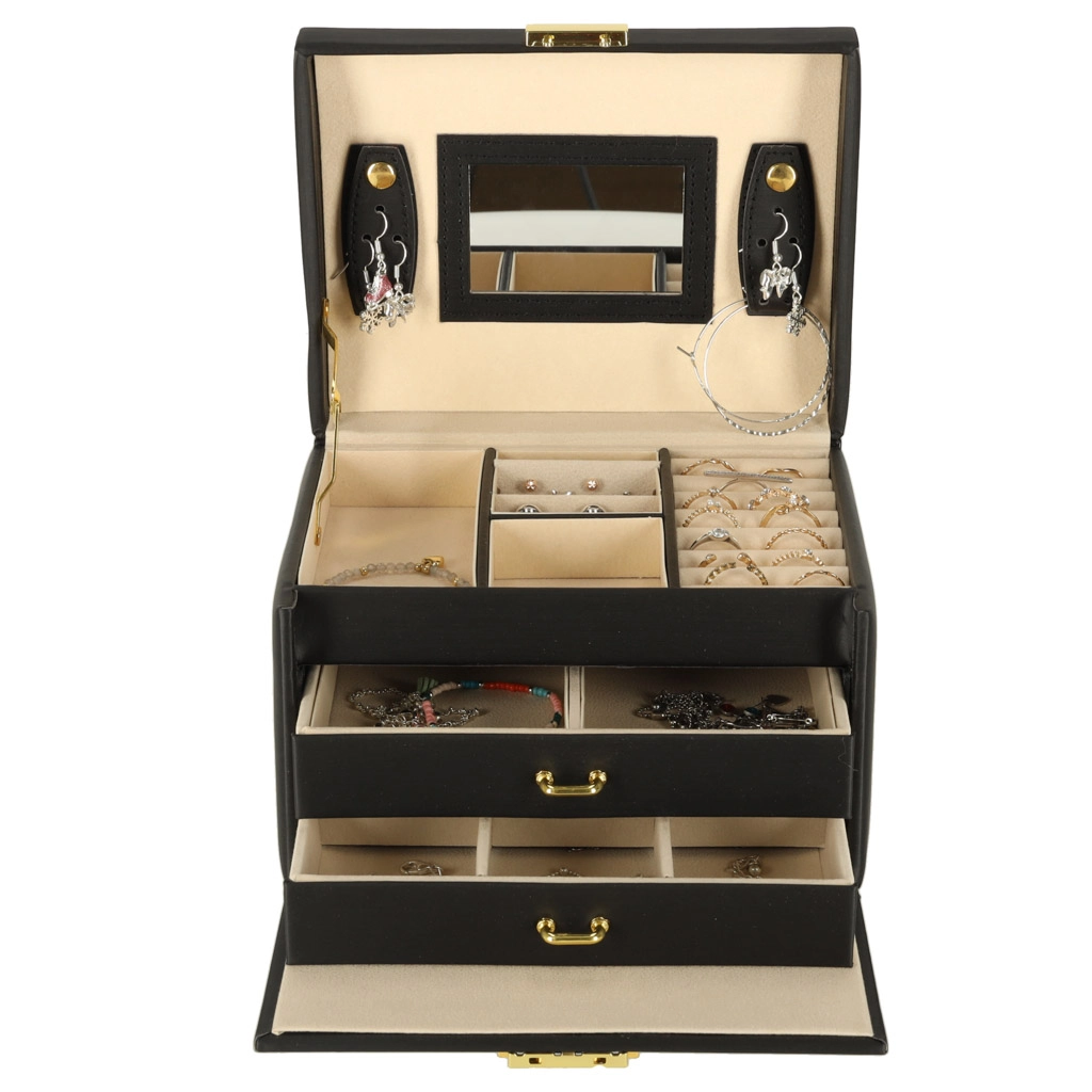 Elegante zwarte sieradendoos met spiegeltje en lades voor overzichtelijke opslag van ringen, oorbellen, armbanden en kettingen. Biedt ruime vakken, twee lades, zachte voering tegen krassen en sluiting met sleuteltje voor extra veiligheid. De ideale oplossing voor georganiseerde sieradenopslag thuis en onderweg.