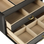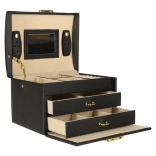De slimme indeling omvat ringrollen, vakken voor kleine items en 2 uittrekbare lades met verdelers voor kettingen, armbanden en oorbellen. Sluiting met sleuteltje en een betrouwbare klapsluiting zorgen voor veilige opslag van kostbaarheden.