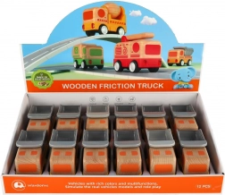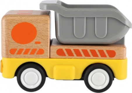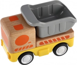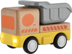 Robuust houten vrachtwagentje met vliegwielaandrijving dat elke kleine bestuurder zal verrukken! Het vliegwiel zorgt ervoor dat een zachte duw voldoende is, waarna het wagentje vanzelf naar voren zoeft. Ideaal voor kleine kinderhanden.