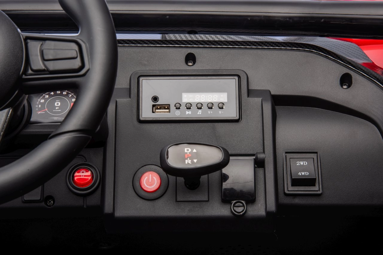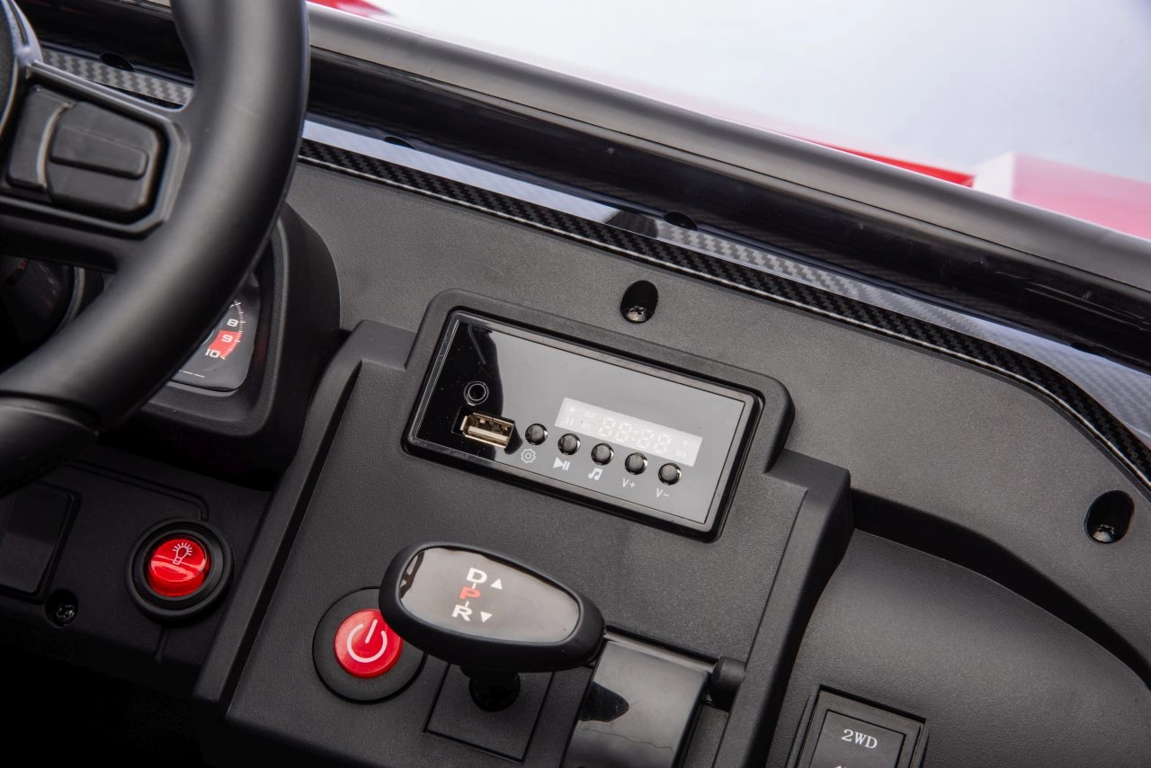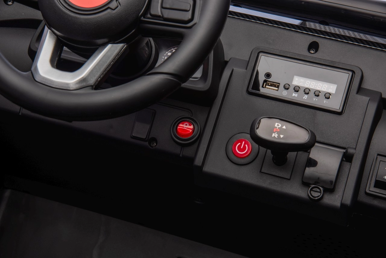 De ingebouwde audiopanelen met USB, MP3, FM-radio en AUX-invoer zorgen voor extra speelplezier en het afspelen van favoriete liedjes. Bovendien heeft de auto geluidseffecten en een claxon direct op het stuur voor nog meer rij-authenticiteit.