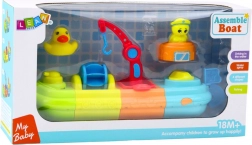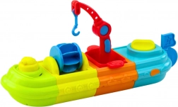 De boot bestaat uit vier kleurrijke modules die samen een groot geheel vormen. Aan boord zijn grappige passagiersfiguren – een eendje en een schildpad, en veel bewegende onderdelen, zoals een kraan met haak, een waterrad en een waterkanon. Het eendje kan water spuiten, wat elk kind zeker aan het lachen zal maken. Andere bakjes maken het mogelijk om water over te gieten, waardoor het spel verrijkt en sensorische ontwikkeling bevorderd wordt.