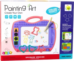 De set bevat vier verschillende stempels en vier sjablonen voor tekenen, die de creativiteit bevorderen en de eerste stappen in tekenen gemakkelijk maken. Het kleurrijke magnetische veld trekt de aandacht van het kind en de compacte afmetingen, samen met een praktische handgreep, maken het gemakkelijk om het bord overal mee naartoe te nemen - voor een wandeling, in de auto of op reis.