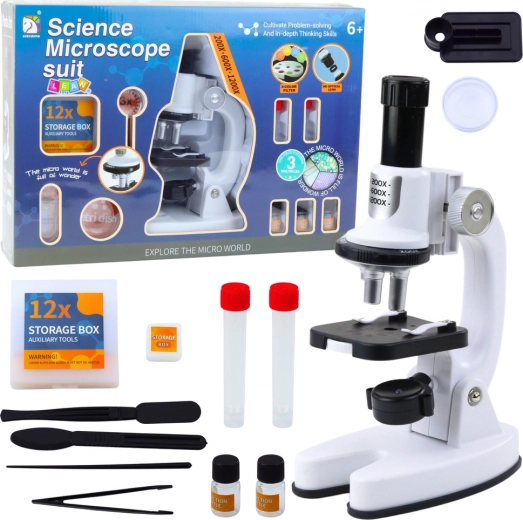 De set bevat een reeks onmisbare hulpmiddelen – een pipet, pincet, monsters, flesjes, containers en objectglaasjes, waarmee verschillende interessante experimenten en observaties kunnen worden uitgevoerd. Alles is verpakt in een stevige behuizing, waardoor de microscoop een ideaal cadeau is.