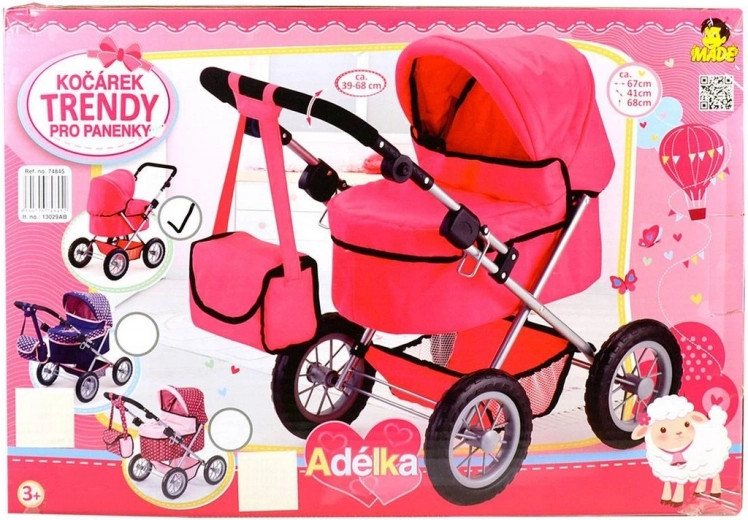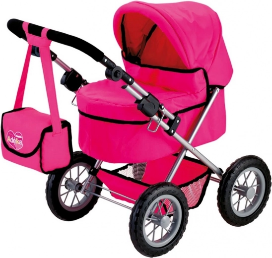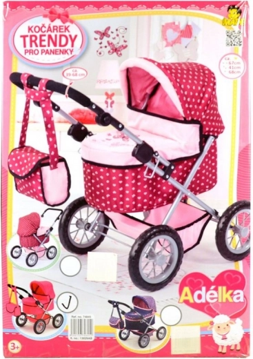 Diepe poppenwagen in modern design in roze kleur, ideaal voor poppen tot 42 cm, inclusief pop Adélka. Gemakkelijk in- en uit te klappen voor comfortabele uitstapjes.
