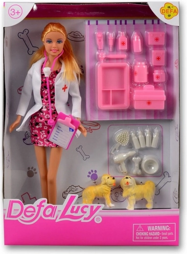 Word dierenarts met pop Lucy en haar schattige hondjes. Complete set met een witte jas en accessoires voor het onderzoeken van dierpatiënten.